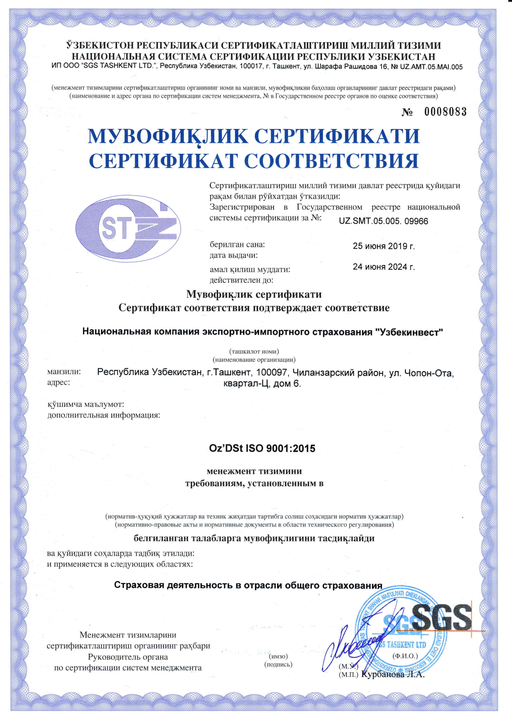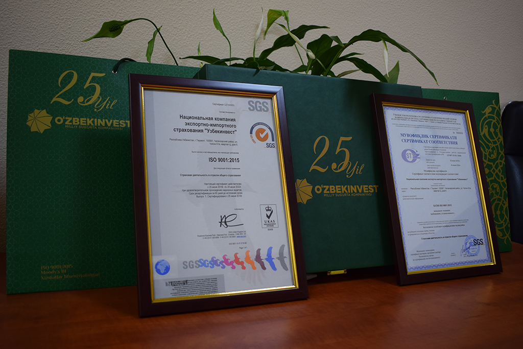 Национальная страхования компания «Узбекинвест» успешно прошла сертификацию Системы менеджмента качества и вновь получила подтверждение её соответствия требованиям Международного стандарта ISO 9001:2015.